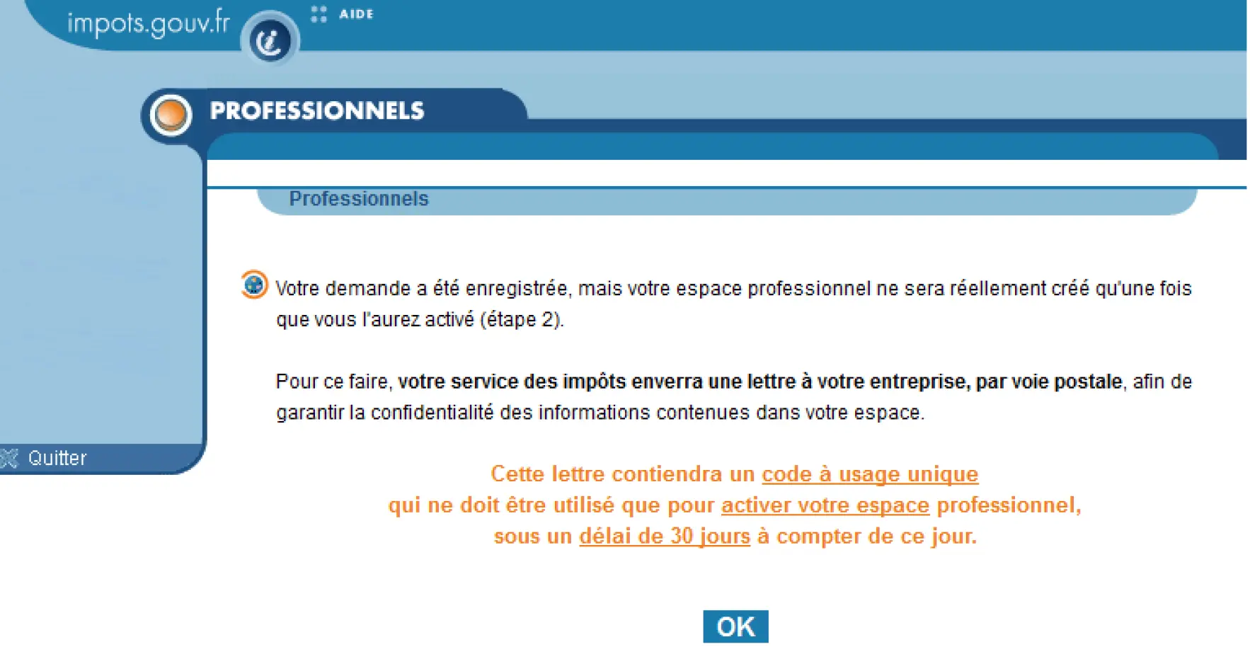 Votre espace professionnel est créé sur impot.gouv. Mais attention, vous ne pouvez pas encore profiter pleinement de ces services. Vous devrez en effet activer votre compte.