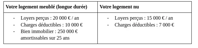 Côté revenus fonciers : votre base imposable est fixée à 8 000 € (15 000 € - 7 000 €)En cumulant LMNP et location vide et en choisissant le régime réel, l’assiette imposable de vos revenus locatifs n’est que de 8 000 €.