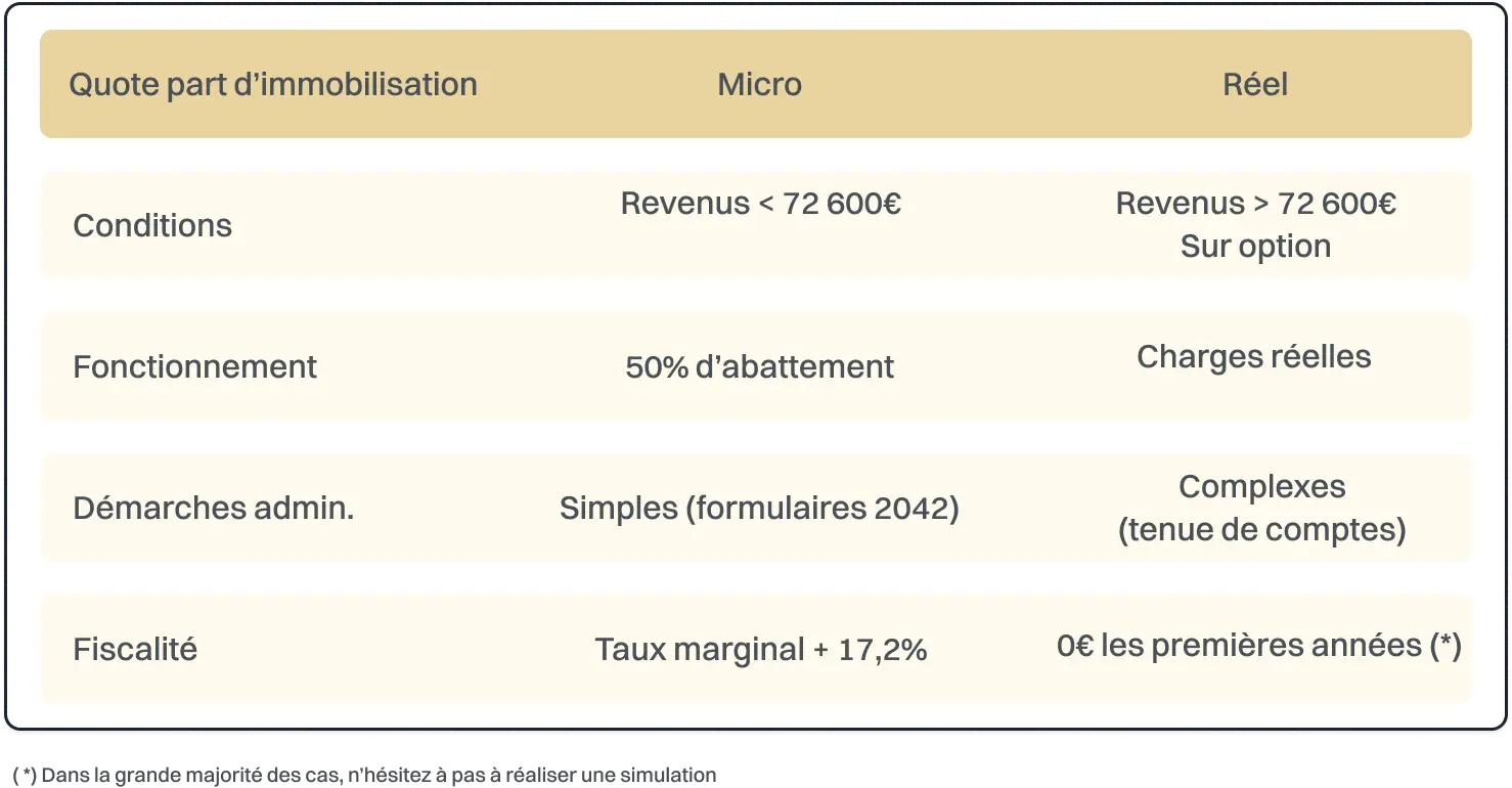 Si vos recettes locatives sont inférieures à 72 600€ vous pouvez également optez pour le régime réel le plus souvent dans une logique d’optimisation fiscale.