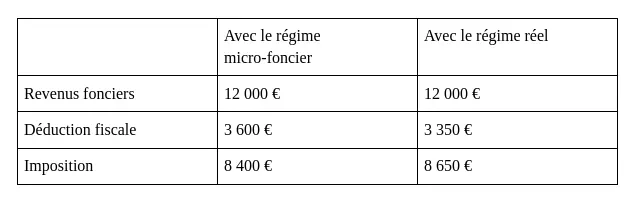 Dans cette hypothèse, il est préférable d’opter pour le régime micro-foncier, puisque votre base imposable sera réduite de 250 €.